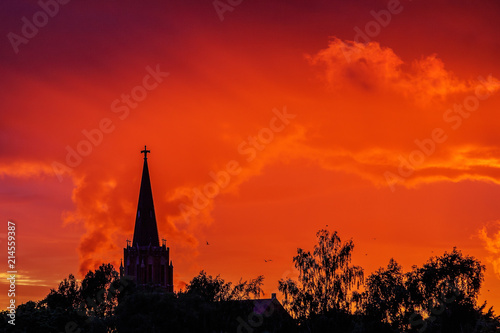 © Normunds, Obraz premium zdominowane przez słońce wieże kościoła z kolorowym niebem