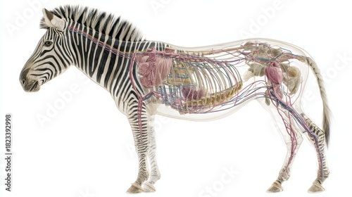 © Wasun, Obraz premium Zebra anatomy showing internal organ placement and vascular system with transparent body revealing muscles, bones, and circulatory structure in detailed side view