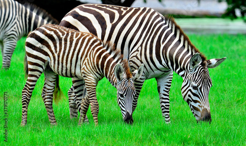 © prin79, Fototapeta premium Zebra and its pony with black and white stripe camouflage eating grass in the green field