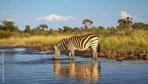 © siraphol, Naklejka premium Zebra drinking water at savanna riverbank with reflected stripes in calm light