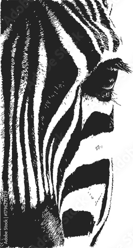 Obraz premium Zebra face sketch, hand drawn vector, close up with detailed stripes and eye...