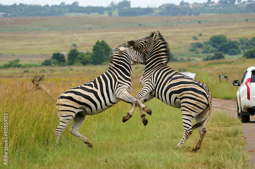© Phillip, Naklejka premium Zebra fighting for Dominance over females in mating season in the herd. Biting and kicking at each other until one backs out or runs away. Rietvlei Pretoria Gauteng South Africa