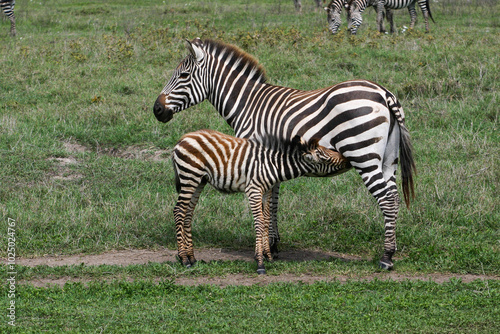 Fototapeta premium Zebra foal suckles a zebra mare