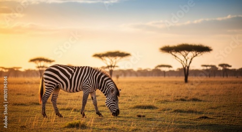 © musa, Obraz premium Zebra Grazing in African Savanna at Sunset with Acacia Trees.