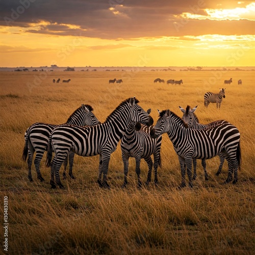 © Gucin, Naklejka premium Zebra Herd in Golden Grasslands at Sunset, African Savanna Wildlife Photography