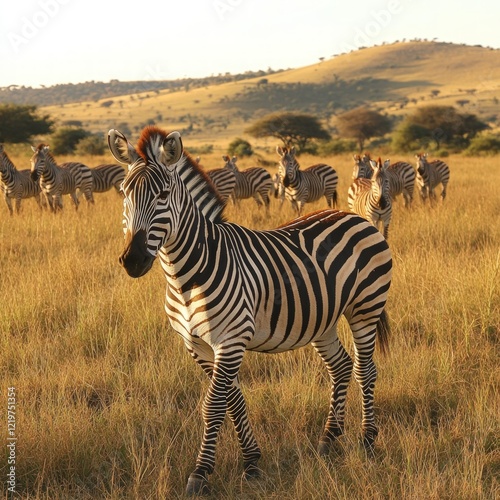 © Ali, Naklejka premium Zebra herd in golden savanna grassland.