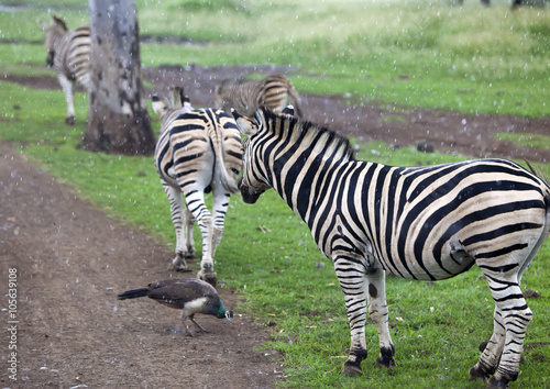 Fototapeta premium Zebra herd in the pouring rain