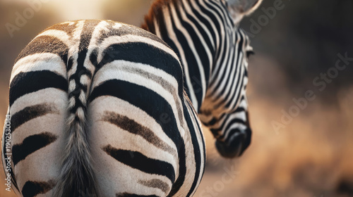 © Bonsales, Fototapeta premium Zebra hindquarters showing bold black and white stripes and natural pattern in savanna environment