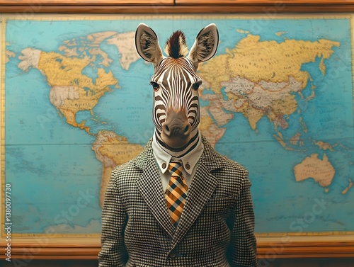 © Thares2020, Fototapeta premium Zebra in a suit and tie stands before a world map in a classroom setting