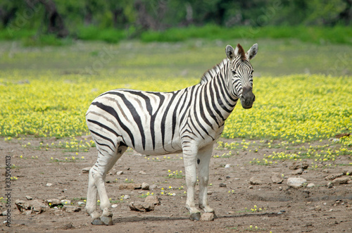 © Bryony, Naklejka premium Zebra in Etosha, field of yellow flowers in background