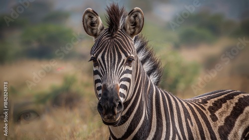 Obraz premium Zebra in the wild with distinctive black and white stripes and a blurred...