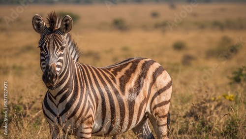 Obraz premium Zebra in the wild with distinctive black and white stripes. Savannah...