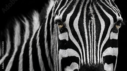 Naklejka premium Zebra looks directly at the camera with bold black and white stripes,...
