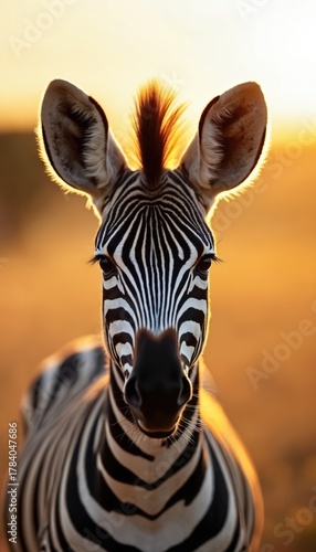 Naklejka premium Zebra portrait at sunset. An animal with black and white stripes stands against warm golden light. This photo captures a zebra head close up in nature.