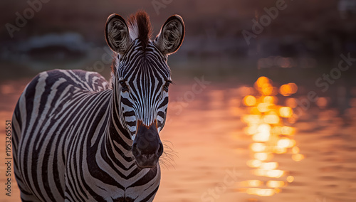 © siraphol, Fototapeta premium Zebra portrait at sunset by reflective water, warm glow and calm gaze