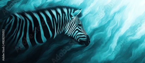 © Almahyra, Fototapeta premium Zebra portrait, teal waves background, artistic