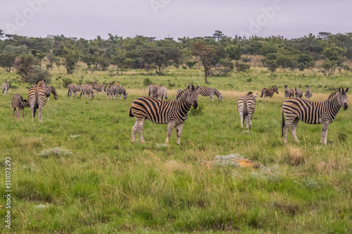 Naklejka premium Zebra's grazing in the wild at the Welgevonden Game Reserve in South Africa