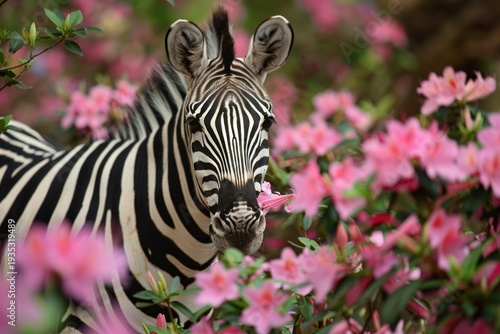 © nsit0108, Fototapeta premium Zebra smelling a delicate pink azalea flower, blending with nature in a striking portrait