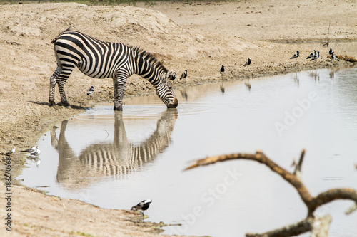 © anca enache, Fototapeta premium Zebra species of African equids (horse family) united by their distinctive black and white striped coats in different patterns, unique to each individual in Tarangire National Park, Tanzania
