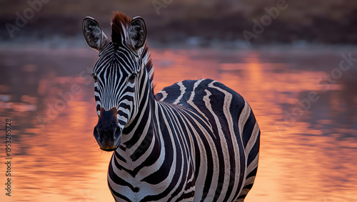 © siraphol, Obraz premium Zebra standing by water at sunset with warm reflective light and vivid stripes