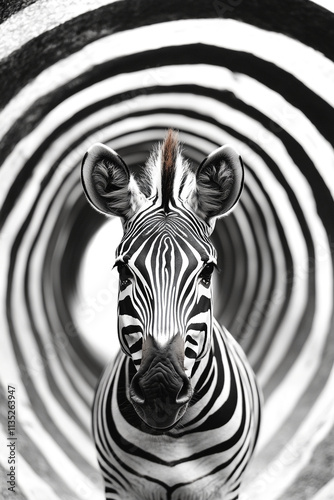 Fototapeta premium Zebra standing confidently in a circular tunnel of stripes during daylight in...