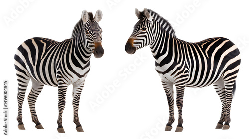 © Usama, Fototapeta premium Zebra, standing front view and profile view, stripe pattern sharp and symmetrical, isolated on white background