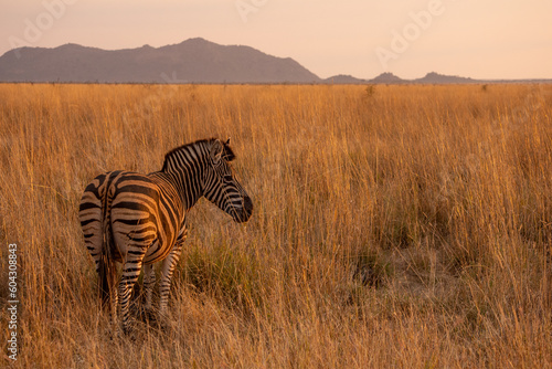 © Hislightrq, Naklejka premium Zebra standing in golden light and tall grass in Madikwe