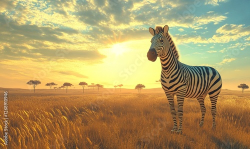 © Murda, Naklejka premium Zebra standing in golden savanna sunlight.