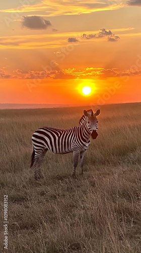 © Larysa, Obraz premium Zebra Standing in Grassland at Sunset