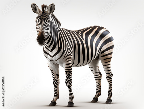 © Vitalii, Fototapeta premium Zebra standing isolated on white background. Full body. African Savanna animal. Zoo and travel. Photography generated by AI