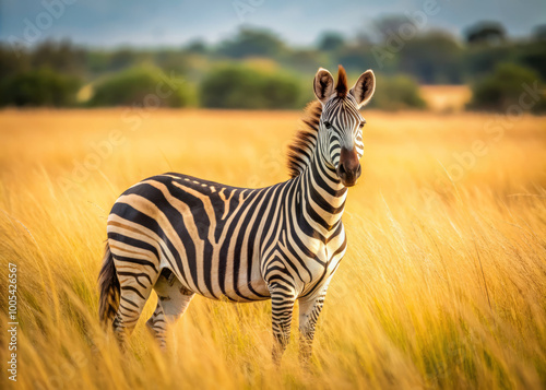 © Arethaawykoff, Fototapeta premium zebra stands gracefully in tall golden grass, showcasing its striking black and white stripes against serene natural backdrop. scene evokes sense of tranquility and beauty in wild