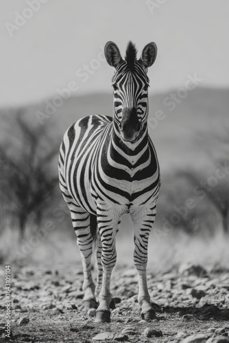 © InfiniteStudio, Obraz premium Zebra stands in the open landscape with a backdrop of hills and sparse trees during the day