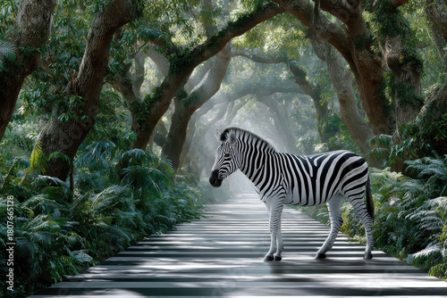© YouraPechkin, Fototapeta premium Zebra stands on a striped path surrounded by lush greenery in a misty forest setting