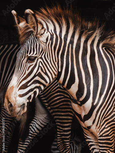 © Heart in pictures, Naklejka premium Zebra stands still in the shade with other zebras in the background