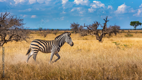 © siraphol, Obraz premium Zebra walking through sunlit golden savanna with scattered trees and blue sky