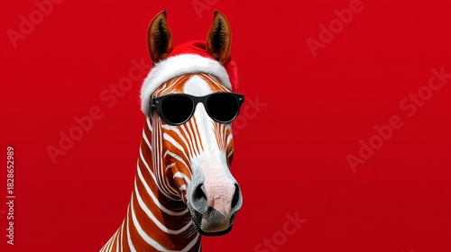 © Nataliia_Trushchenko, Obraz premium Zebra wearing festive Santa hat and stylish sunglasses, posing against vibrant red background, creating a playful and whimsical holiday atmosphere for seasonal celebrations