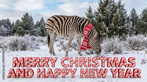 Naklejka premium Zebra Winter Christmas Day - A zebra wearing a scarf wishes happy holidays. The scarf symbolizes warmth, the zebra represents nature, and the snow signifies peace