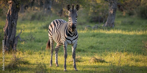 Obraz premium Zebra with striped pattern grazing in a paddock, natural environment...