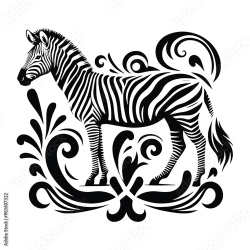© Cici, Obraz premium Zebra with victorian flourish decoration, stencil logo, black and white animal illustration