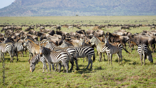 Fototapeta premium Zebras and Wildebeests Are Grazing Together in the Stunning and Beautiful Serengeti Plains