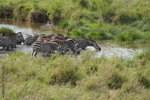 © Soaps, Naklejka premium Zebras at the Waterhole – Striped Serenity drinking water with the herd on the African Plains