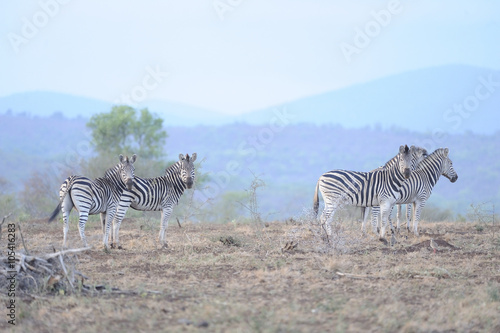 © wolfavni, Naklejka premium Zebras (Equus burchelli) pose against an african skyline, Zululand, South Africa.zimanga