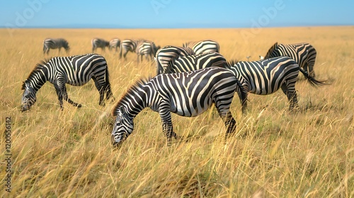 © Design By Reiga, Fototapeta premium Zebras grazing in African savanna