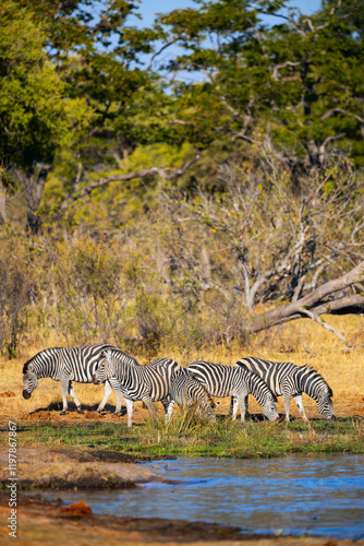 © TravelPhotoBloggers, Fototapeta premium Zebras grazing near water.