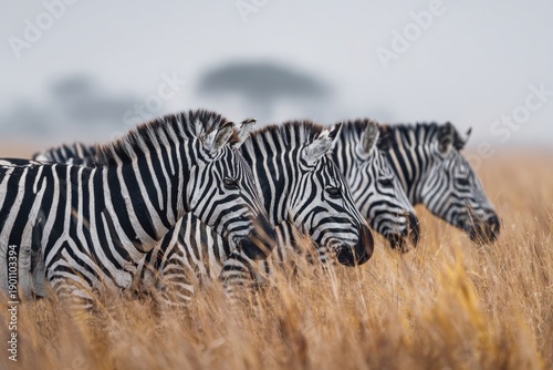 © Tatiana, Fototapeta premium Zebras herd standing together in dry savanna grass