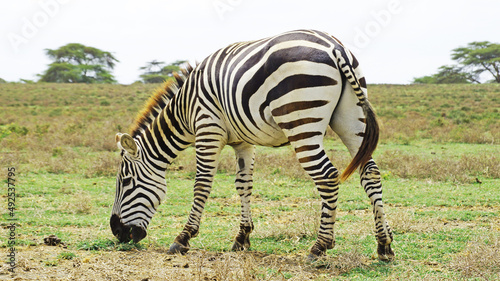 Naklejka premium Zebras in the middle of the African savannah stand behind the camera. A zebra grazes in a national park in Kenya.