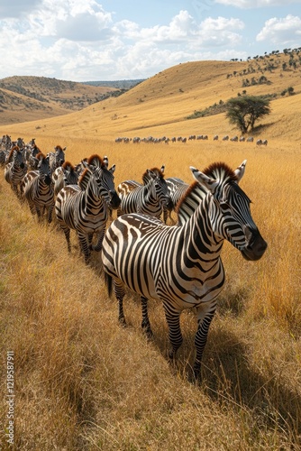 © Ali, Naklejka premium Zebras migrating across golden savanna.