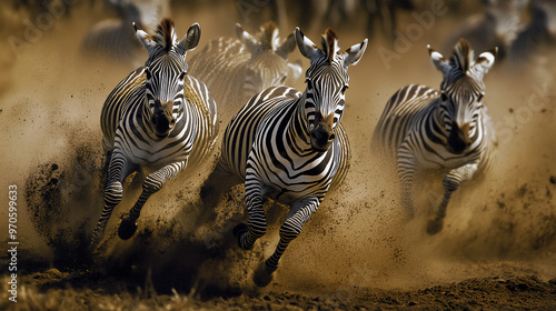 © ai_arts, Fototapeta premium Zebras running in the African savannah. AI Generative