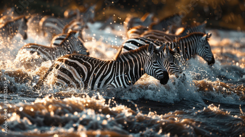 © M, Fototapeta premium Zebras running through river water during migration at sunrise in African savannah