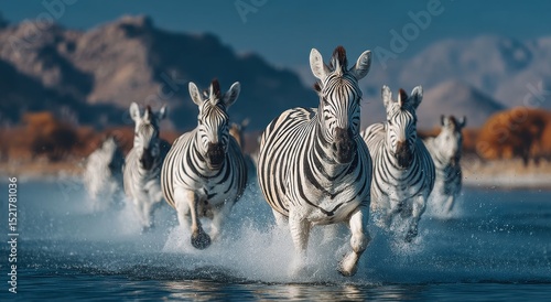 © Generative AI, Fototapeta premium Zebras Running Through Water in Africa, Showcasing Wildlife Conservation and Natural Beauty, Ideal for Travel and Tourism Marketing : Generative AI